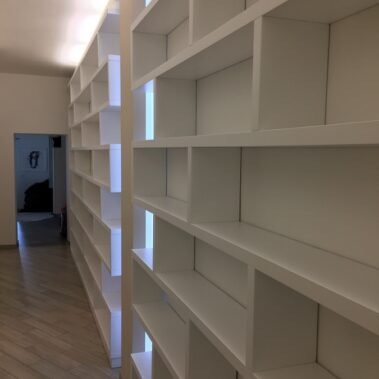 The bookcases are completely custom made in solid wood, laminated veneer and laminate of all types, multilayer and MDF; and through the choice of various essences. Lacquering is done with polyurethane varnishes or water in any color shade, with open or closed pore finishes. They can be linear and non-linear, angular, suspended, and in any shape and curvature, in any modern or classic style.
